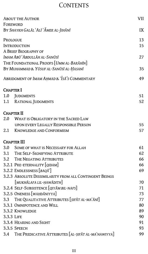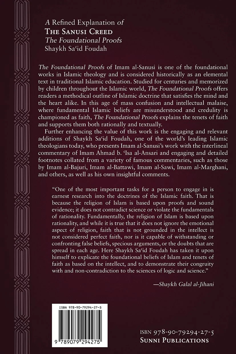 The Foundational Proofs of Imam al-Sanusi is one of the foundational works in Islamic theology and is considered historically as an elemental text in traditional Islamic education. Studied for centuries and memorized by children throughout the Islamic world, The Foundational Proofs offers readers a methodical outline of Islamic doctrine that satisfies the mind and the heart alike. In this age of mass confusion and intellectual malaise, where fundamental Islamic beliefs are misunderstood and credulity is championed as faith, The Foundational Proofs explains the tenets of faith and supports them both rationally and textually.